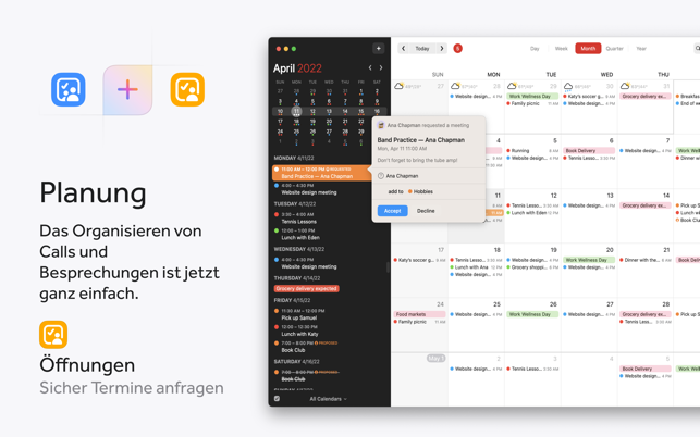 Die Eingabe über das Menüleisten-Fenster ist schnell, einfach und für viele Termine geeignet. Hier ein Praxisbeispiel für natürliche Sprache, die Eingabe ist übrigens recht hübsch animiert: