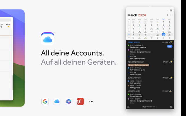 Die Entwickler mussten sicher durch so manchen Reifen springen, verwunderlich ist am Ende die extreme Designnähe zum integrierten Kalender von Apple - lediglich die Sidebar auf der linken Seite und das per Menüleiste aufgerufene Mini-Fenster sehen eigenständig aus. Ob das nicht noch Ärger gibt?
